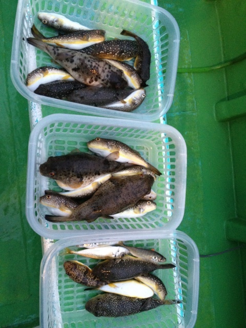 - ウネリ有り底荒れ気味でしたが、アカメが一人あたり1~2匹・コモンフグが一人あたり3~6匹混じりで、おかず~お土産にはなりました。 アカメとコモンフグどちらも貴重でとても美味しいですよ(^^)!2番手の方は8匹でした。他にアジ、カワハギが混じりました。