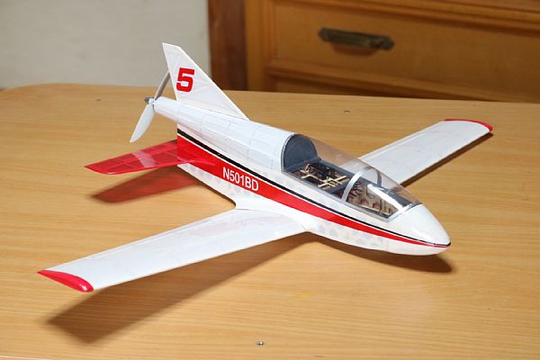 | 以上でBD5-100は完成しました。 良かった点 (1)胴体側板を穴あきにしたのは良いアイデアだと自画自賛です。 (2)オラカバの重さを再認識しました。 (3)スケールらしいデザインになりました。 悪かった点 (1)Eライトフィルムは皴になりやすいです。でも、軽さと価格の安さは捨てがたいです。 (2) モーターの振動が大きいです。ベアリングにもっと良いものを使うべきでした。 (3)キャノピーの工作が雑でした。 |
