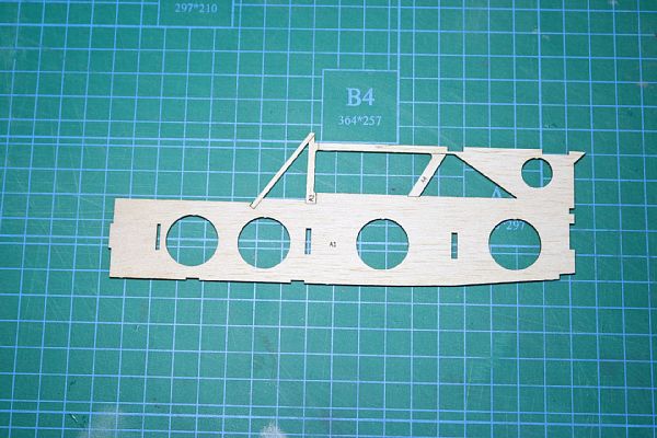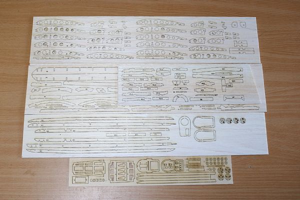 ![]() レーザーカットしました。1.5mmが2枚、2mmが2枚、3mmが1枚、1.2mmベニヤが1枚です。タイガーモスに比べ部品が少ないです。 |