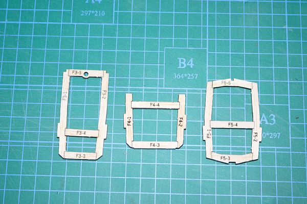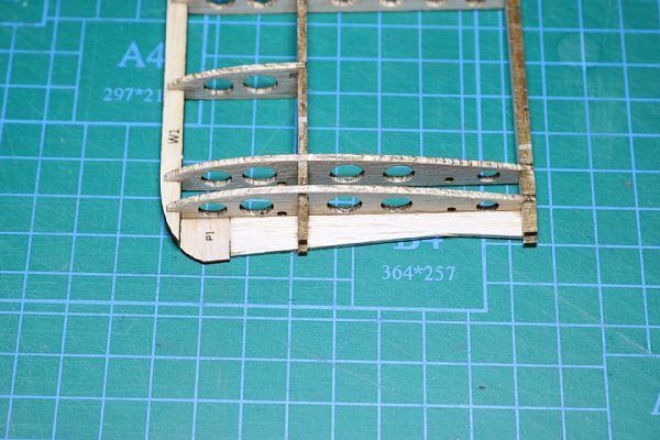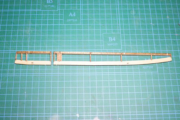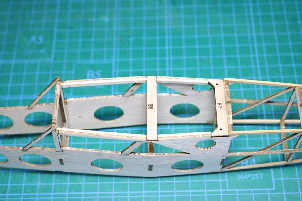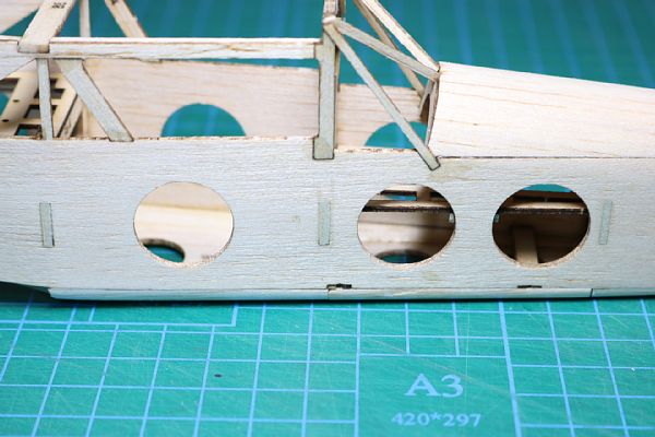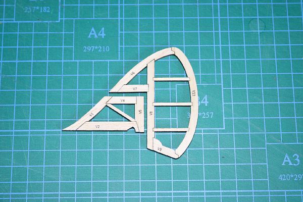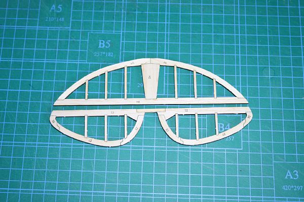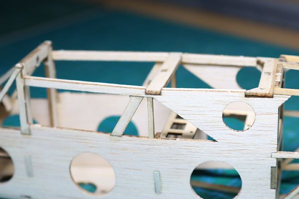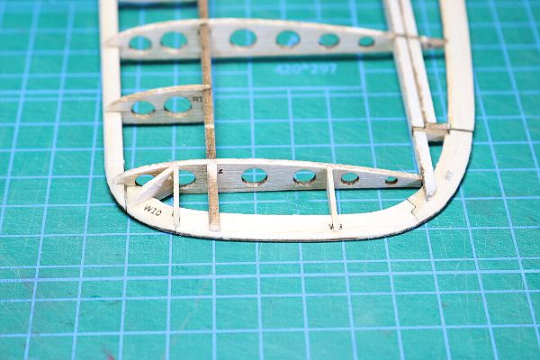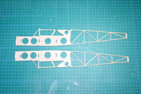 ![]() 胴体側板から組み立てます。メインの側板に、バルサの目の方向を変えるために窓枠の部品を接着しました。 |