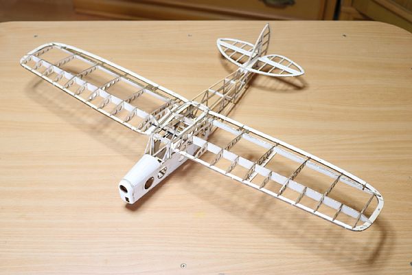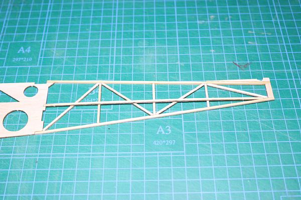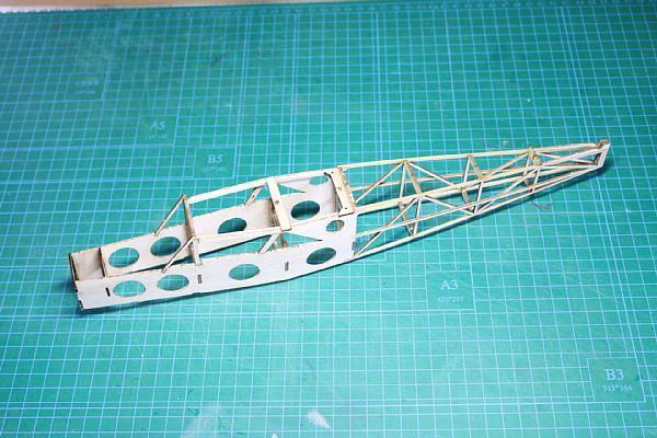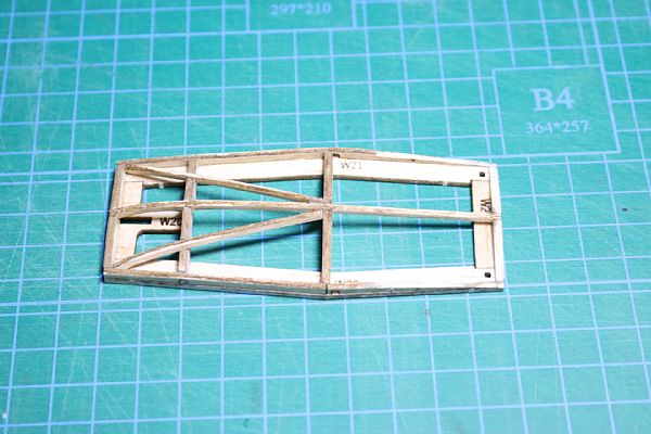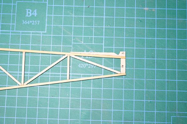 ![]() 原寸図面の上で後ろのトラス構造を組み立てます。上下の長い棒は1.5x2mmのヒノキ棒、ほかは1.5x2mmのバルサです。 |