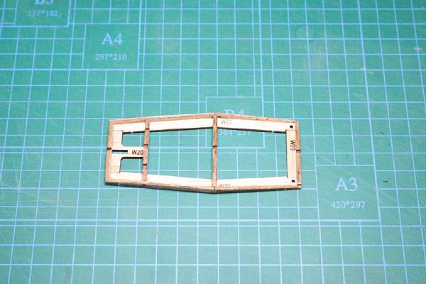 ![]() 図面から翼を取り外し、前縁材W1を丁寧に取り付けます。かなり注意しないときちんと嵌まらなくて歪みの元です。 |