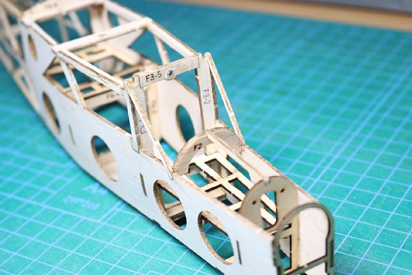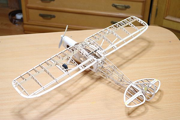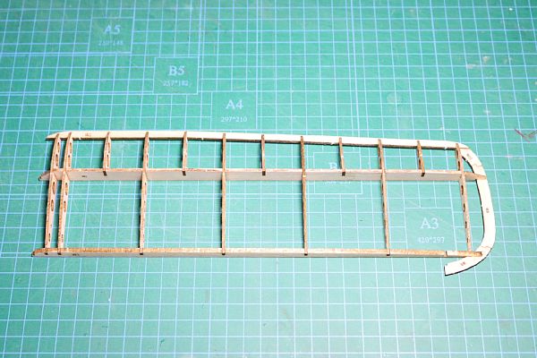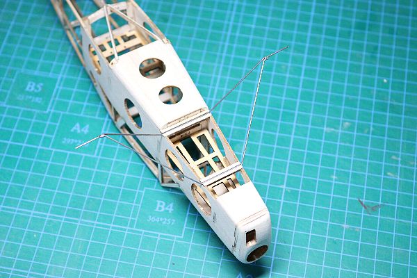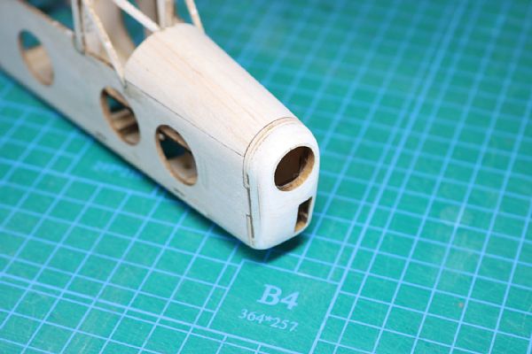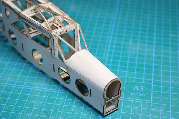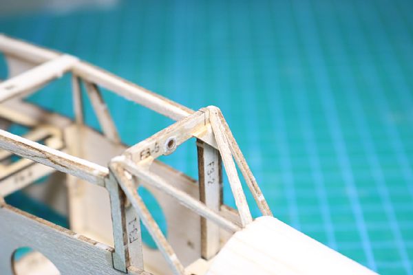 ![]() プランク材を曲げ癖を付けてから貼りました。現物合わせで微調整しています。その後、操縦席の窓枠(斜めの棒)を貼りました。 |