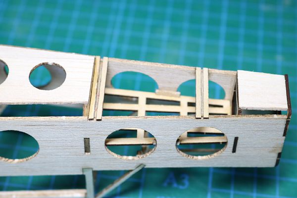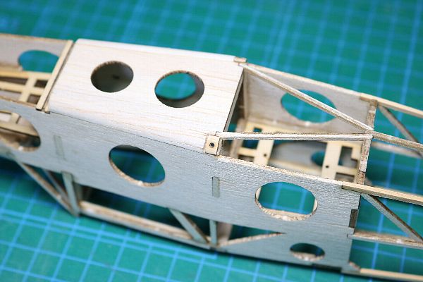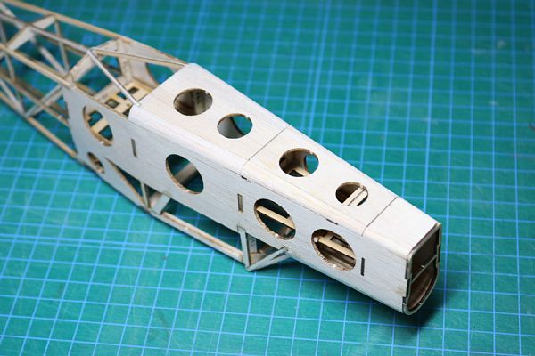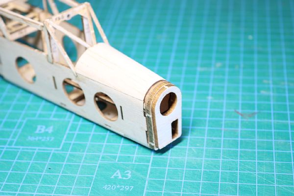 ![]() 胴体側板のほぞ組みの部分が焦げが目立つので、バルサで蓋をしました。 |