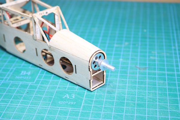 ![]() カウリングは3mmバルサを3枚貼り合わせています。モーターの高さとカウリングの高さを揃えたら機首に仮止めしてサンディングします。 |