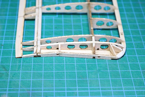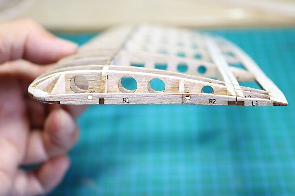 ![]() 中央翼を使って現物合わせで根元のリブR1とR2を接着します。 |
