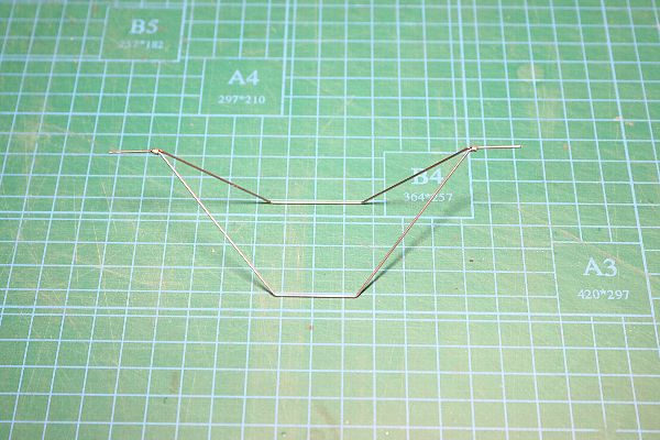 ![]() 歪みもなく出来上がりました。このように前後のピアノ線を半田付けすれば、0.8mmでも強度は十分です。 |