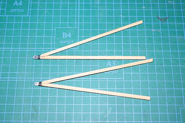 ![]() ストラットを組み立てました。三角頂点の取り付けの部品は0.3mmのアルミ板です。糸で縛って瞬間を流せばガッチリつきます。 |
