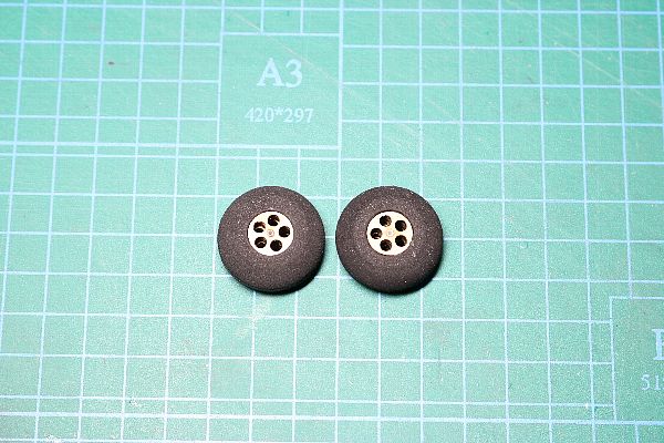 ![]() タイヤを作りました。ホイールはバルサとベニヤを貼り合わせ、タイヤ本体は5mmウレタンスポンジを貼り合わせています。 |