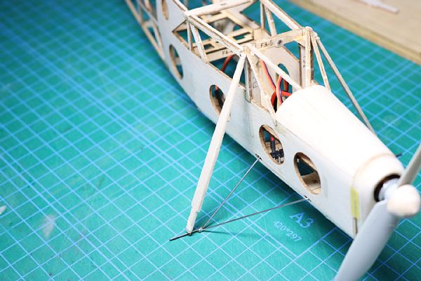 ![]() 脚のストラットは1.5mmバルサです。右側に脚の軸に取り付ける銅線の輪、左は窓枠に虫ピンで固定します。どちらも糸で縛って補強してます。 |